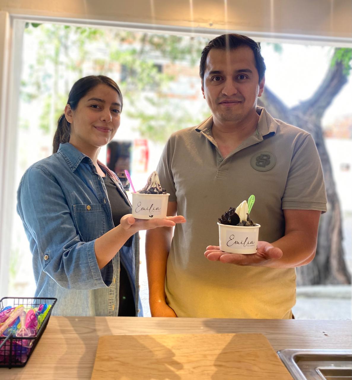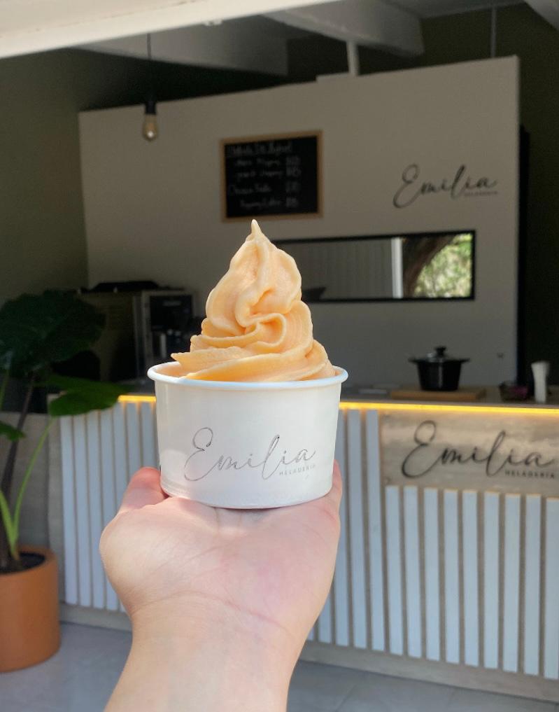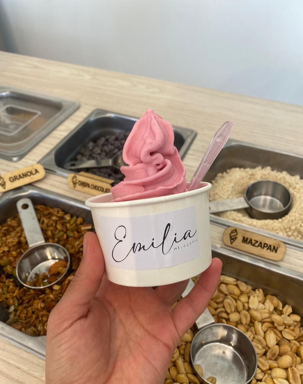 Helados de yoghurt con toppins. En Emilia podrás encontrar sabores de helado como: taro, carbón, acaí, frambuesa, durazno, algodón de azúcar, guayaba, entre otros.