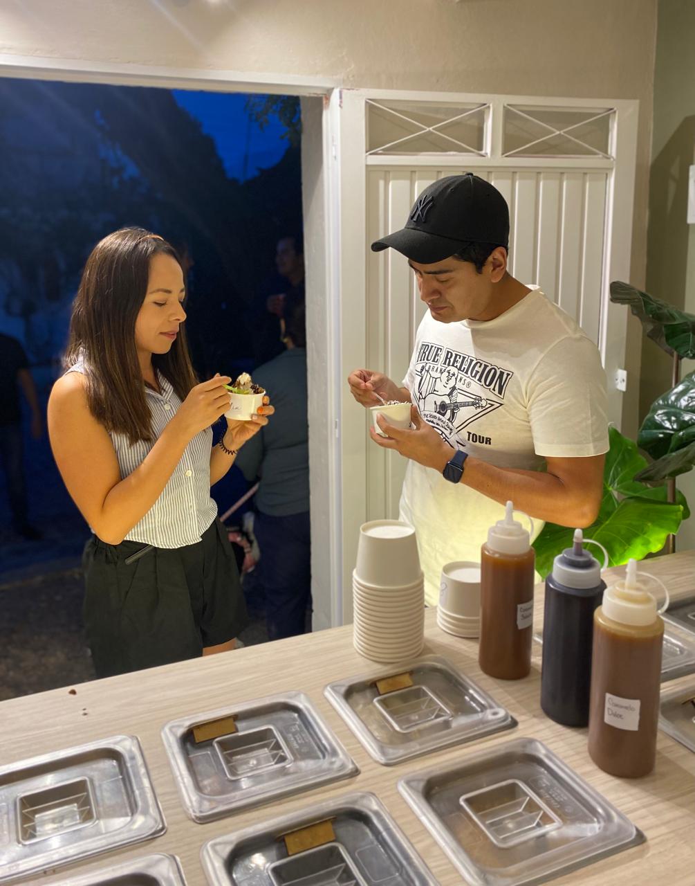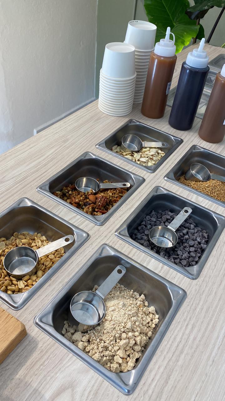 Toppings como: perlas frutales, mazapán, almendras, chispas de chocolate, coco, oreo, granola, entre algunos más.